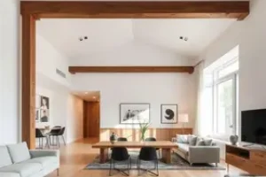 Reforma de apartamento integra ambientes e valoriza viga aparente com design único.